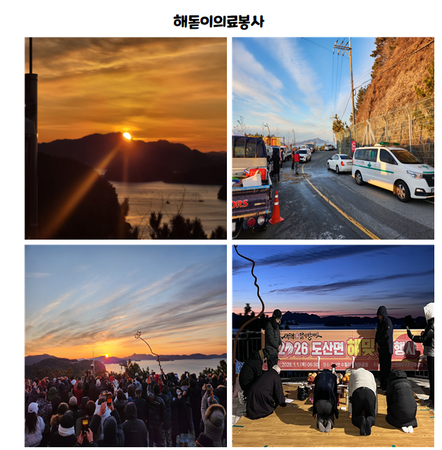 -1¿ù1ÀÏ µµ»ê¸é ¼ö¿ù ÇØµ¸ÀÌ Çà»ç¿¡ ÀÇ·áºÀ»ç Áö¿øÀ» ´Ù³à¿Ô½À´Ï´Ù. »õÇØ ù³¯ Èñ¸ÁÂù ±â¿îÀ» ¹ÞÀ¸¸ç 2026³â º´¿À³â ù ¹ß°ÉÀ½À» ³» µó¾ú½À´Ï´Ù.